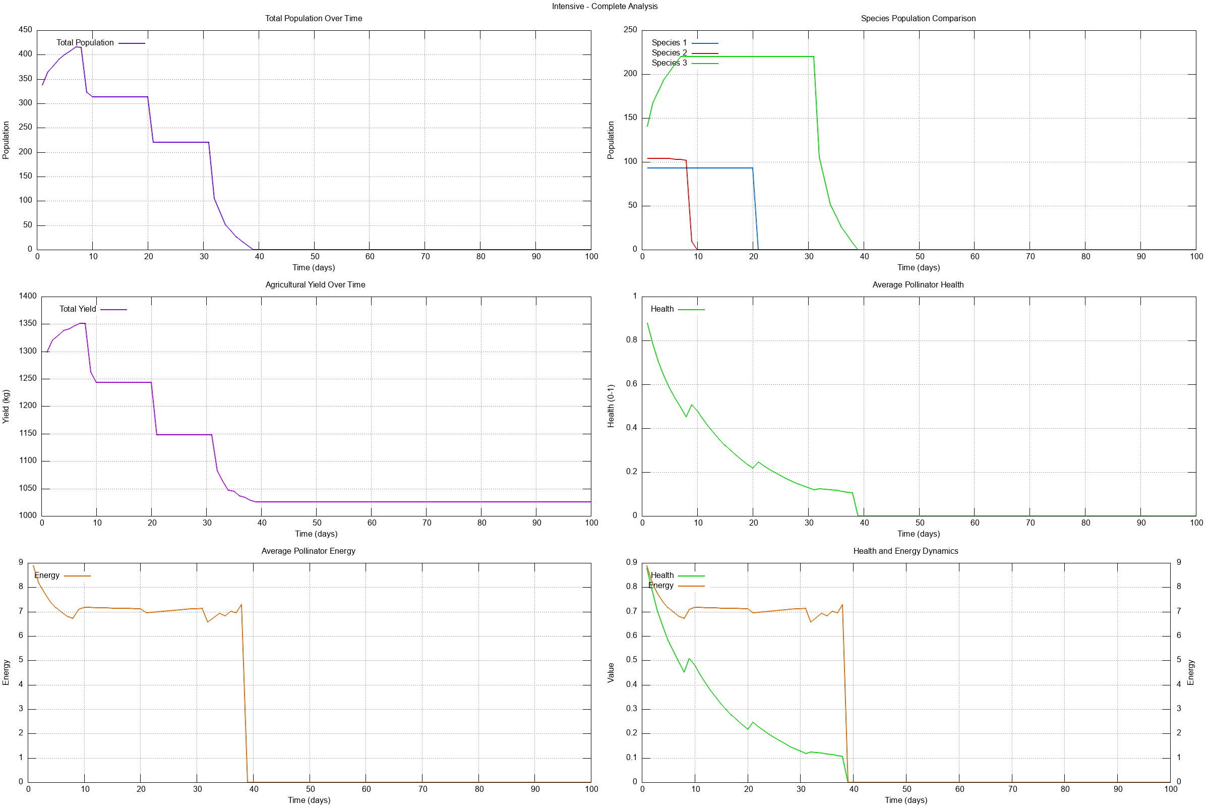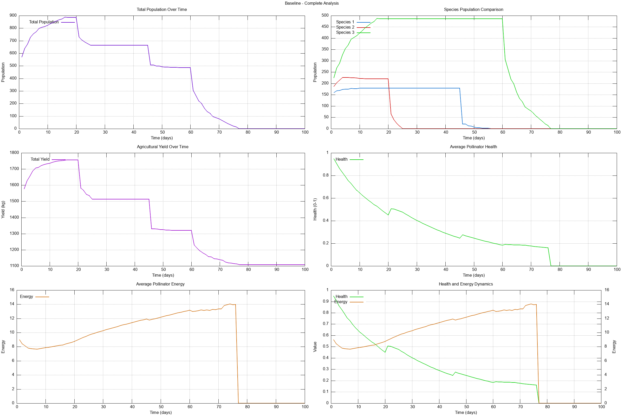 This comprehensive agent-based pollination ecosystem framework demonstrates that analyzing pollinator-agricultural trade-offs effectively requires sophisticated integration of individual behavior, spatial landscape dynamics, multi-species pollination services, dynamic yield calculation, and comprehensive scenario analysis. By simultaneously modeling individual agents, population dynamics, spatial heterogeneity, agricultural outcomes, and management strategies, I created a computational framework that transforms complex ecosystem challenges into actionable agricultural policy tools.
