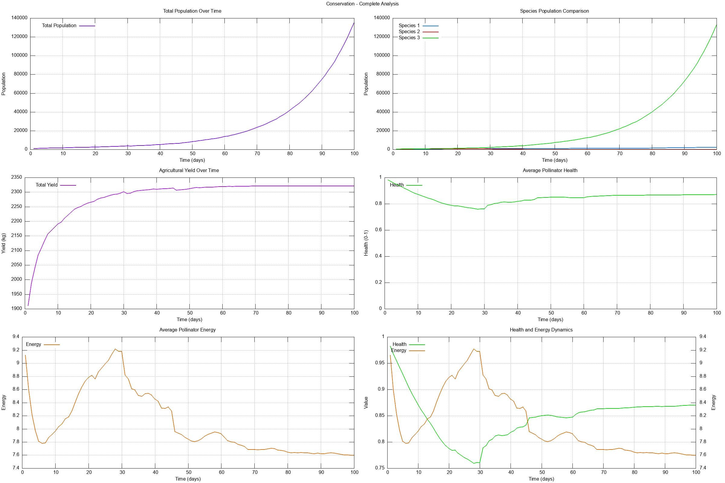 The system operates under a comprehensive computational framework incorporating multiple modeling paradigms (agent-based simulation, spatial dynamics, population ecology, agricultural economics), advanced implementation techniques (C++17 with OpenMP parallelization, efficient data structures, memory management), comprehensive evaluation metrics (population dynamics, yield outcomes, health statistics, extinction events), parallel processing with multi-threaded agent updates for scalable simulation, and sophisticated visualization including time-series plots, species comparisons, and scenario analyses. The framework incorporates comprehensive performance metrics including simulation speed (timesteps per second), population dynamics (growth, extinction, stability), agricultural outcomes (total yield, yield per area), pollinator health (average health, energy, mortality), and scenario comparisons (baseline vs. management strategies).