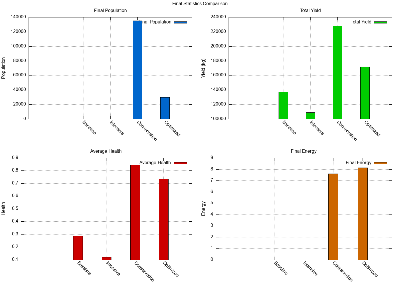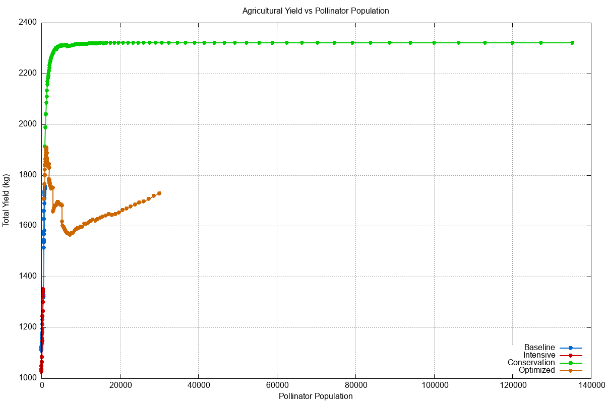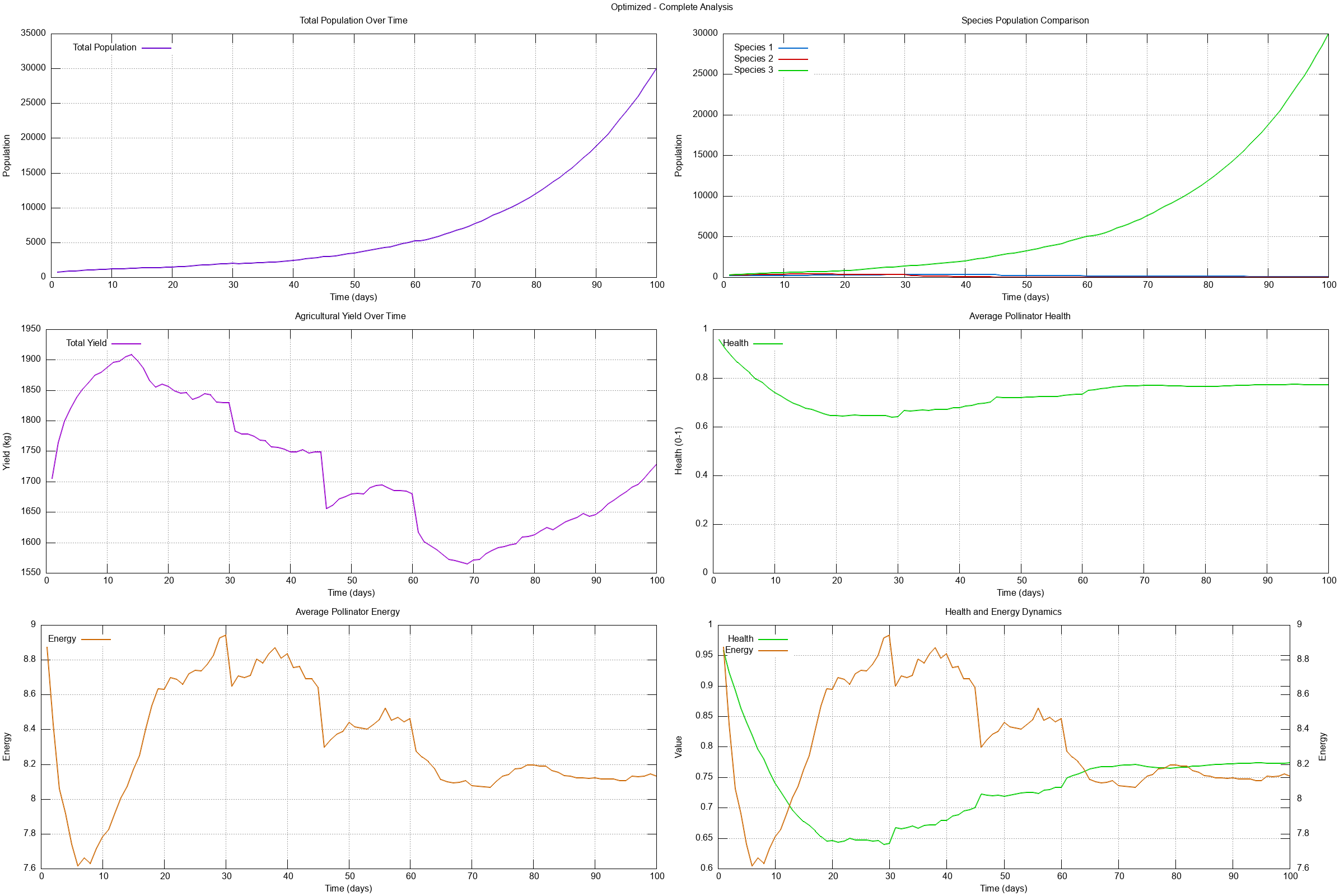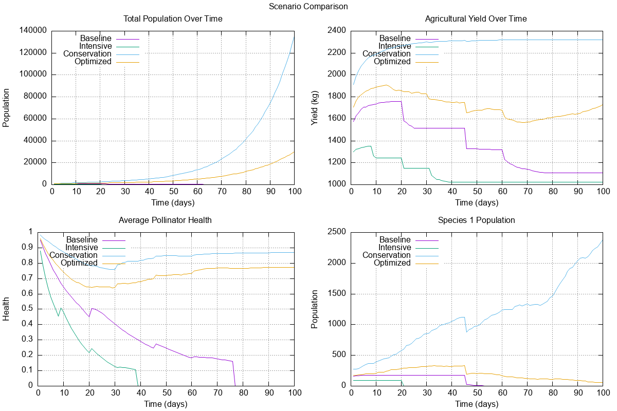 The Results: The comprehensive evaluation achieved significant insights into pollinator-agricultural trade-offs, demonstrating that conservation practices achieve exceptional performance on both pollinator health (population: 135,218, average health: 0.85) and agricultural productivity (total yield: 228,366 kg, +66.3% compared to baseline), high pesticide use leads to catastrophic outcomes (population extinction by day ~39, yield reduction of -20.5%), and optimized spatially heterogeneous management provides balanced trade-offs (population: 30,031, yield: +25.3%, health: 0.73). The system reveals that pollinator health is a critical indicator of long-term ecosystem sustainability, conservation practices maximize both pollinator populations and agricultural yields, and optimized management provides practical pathways to sustainable agriculture. The framework enables efficient scenario analysis with high-performance C++ implementation supporting large-scale parameter sweeps, generating realistic ecosystem dynamics and providing actionable guidance for agricultural policy applications.